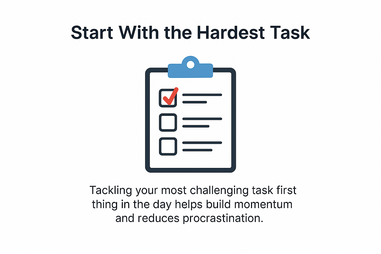 Tackling your most challenging task first thing in the day helps build momentum and reduces procrastination.